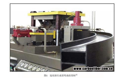 連續(xù)擠壓是一種多工步過程,其成型模具為組合式,多運動部件組成。首先多層熱塑性帶在模具中加熱并壓成層合板,而后將層合板壓入成型模具并加熱壓成所需截面的型材,最后將型材通過連續(xù)壓模壓成所需的彎曲形狀,這種方法可以成型彎曲甚至扭轉和變截面的型材零件,是一種新型的成型工藝。圖4為其成型模具和設備。