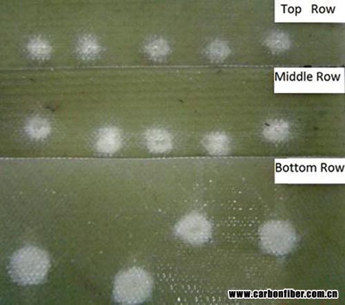 圖3 在采用鉤/環(huán)搭接的“互鎖型”Han-3D玻璃纖維織物(上)以及具有同樣重量的“非互鎖型”平織玻璃纖維織物(下)上所做的低速碰撞測(cè)試,兩種織物都是按0°、+45°、-45°、90°、0°、-45°、+45°和0°的順序依次鋪層、并由亨斯邁先進(jìn)材料公司的Aradur 5003-1環(huán)氧樹脂進(jìn)行真空灌注的一個(gè)8層織物。將試樣放入一個(gè)中心孔直徑為50mm的試驗(yàn)夾具中,采用一個(gè)頭部直徑為12.7mm的沖擊桿在試樣的多處擊打數(shù)次(落錘1kg,落差80cm)??梢钥闯?,采用Han-3D織物生產(chǎn)的復(fù)合材料上的凹痕相對(duì)較小,中間一排顯示出了僅在試驗(yàn)夾具的落差由80cm降低到40cm后,平織的試樣上就出現(xiàn)了較小的凹痕印記